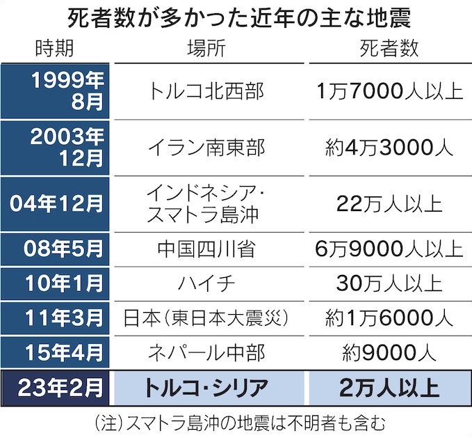 トルコの人的被害としては1999年のイズミット地震(約1万7000人)を上回った。当局によると、1万2000棟以上の建物が崩れるか重大な被害を受けた。