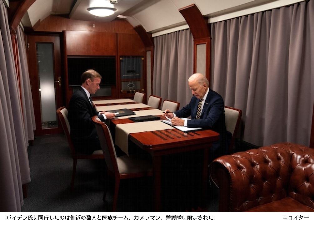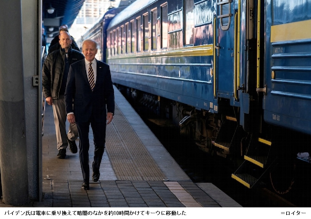 電車に乗り換えて暗闇のなかを約10時間かけてキーウに移動し、現地時間20日午前8時(日本時間20日午後3時)ごろに着いた。バイデン氏は80歳と最高齢の米大統領で、同紙は「骨の折れる旅路だった」と指摘した。