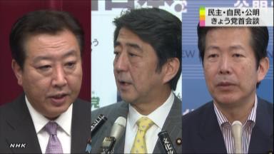 3党首会談決裂=野田首相、解散時期明示せず―自公反発、審議拒否も ―― 野田佳彦首相(民主党代表)は19日午後、自民党の安倍晋三総裁、公明党の山口那津男代表と国会内で約40分間会談した。首相は、赤字国債発行に必要な特例公債法案などの成立に協力を求める一方、谷垣禎一自民党前総裁と合意した「近いうち」の衆院解散について「言葉の重み、責任は十分自覚している」と述べるにとどめ、具体的な時期は明示しなかった。安倍、山口両氏は納得せず、会談は決裂した。/政府・与党は臨時国会を29日に召集する方針だが、自公両党は年内解散の方向性が示されない限り、審議の全面拒否も辞さない構えだ。/会談で首相は、特例公債法案の早期成立に加えて、最高裁が違憲状態とした衆院小選挙区の「1票の格差」是正、社会保障制度改革国民会議の早期設置を要請。具体的には、予算案と特例公債法案を一体処理するルール作りを提起したほか、自民党が主張する衆院小選挙区の「0増5減」の先行実施について「多くの党が言うなら、そういうことを含め幹事長級で議論する」と柔軟姿勢を示した。/しかし、年内の衆院解散を求める安倍、山口両氏は「解散時期を明示してほしい。そうでなければ先の話はできない」と反発。首相は「だらだらと政権の延命を図るつもりはない。条件が整えばきちっと自分の判断をしたい」と理解を求めたが、会談は物別れに終わった。 [時事通信社 2012年 10月 19日 19:56 JST]