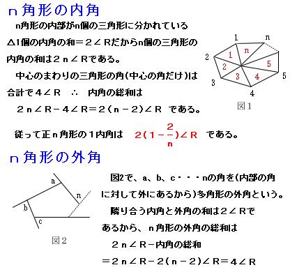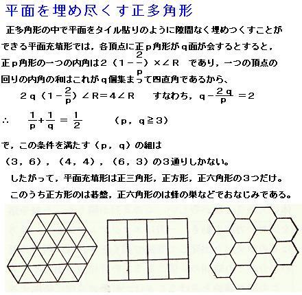 ピタゴラス学派の人々は多角形の内角・外角について考え、これを用いて、平面は合同な三角形、正四角形(正方形)、正六角形を用いた時にのみ多い尽くすことが出来ることを証明した。