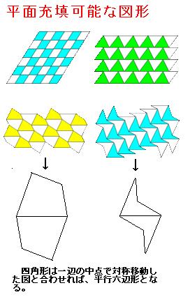 全ての平行四辺形は、1種類で平面充填可能である。また全ての三角形は、合同なものを2つ組み合わせることで平行四辺形となる。従って、全ての三角形は平面充填可能である。また、全ての合同な平行六辺形(3組の対辺が平行で等しい六角形)は平面敷き詰め可能である。また、平行四辺形以外の全ての四角形は、合同なものを二つ組み合わせることで平行六辺形となる。従って、全ての四角形は平面敷き詰め可能なのである。