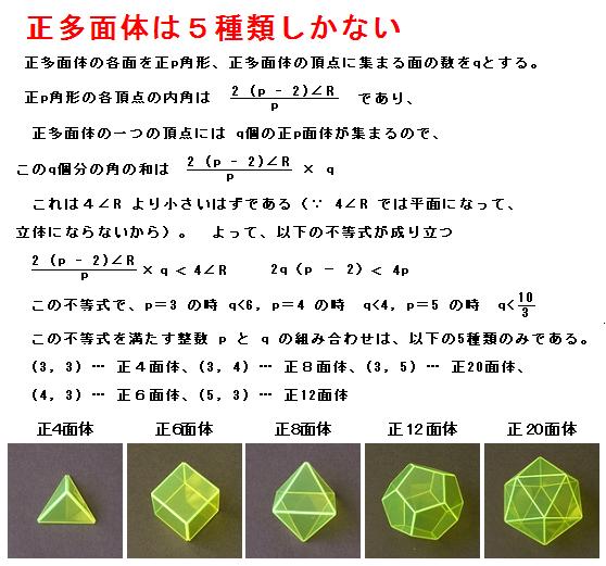 三次元空間の中に一つの頂点を取り、その周りに取ることが可能な正多角形に関する制限から、正多面体が先に示したより五種類のみであることが証明できる。