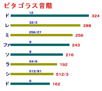 このとき、12・9・8・6 に対応して、ド・ファ・ソ・ド がまず決定される。他の音は、この4音を基本として、次のようにして定められる。