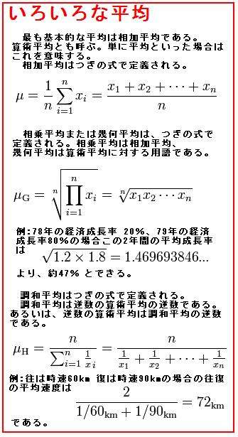 ※平均とはいくつかの数や量の中間的な値を求めること。また、その数値。それらの和をその個数で割る相加平均〔算術平均ともいう〕をいうことが多いが、ほかに相乗平均〔幾何平均とも言う〕・調和平均などがある。