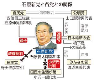 ◇「民自公の補完勢力」か:橋下氏との連携も政策的には難航必至だ。橋下氏の唱える消費税の地方税化に石原氏は否定的。原発を容認する石原氏の立場も、維新の会とは異なる。石原氏は会見で「これから議論したらいい」と述べたものの、橋下氏は「都知事には『政策の一致がないと有権者にそっぽを向かれる。政策、理念の一致が日本維新の会のアイデンティティーそのもの。この部分は譲れない』と繰り返し伝えた」と強調した。/みんなの党の渡辺喜美代表は「石原新党が原発や消費増税を容認するという立場であれば、民自公の幕藩体制の補完勢力だから、維新ではない。せいぜい良くて新選組だ」と皮肉り、橋下氏のパートナーは自分だと自信を示した。/一方、石原氏は小沢氏とは「犬猿の仲」だけに、会見でも「小沢と組むことはない」と明言した。これに対し、小沢氏は25日夜、都内で開いた党結成記念パーティーであいさつしたが、石原氏に関しては一切触れなかった。(jijicom 2012/10/25-20:54)