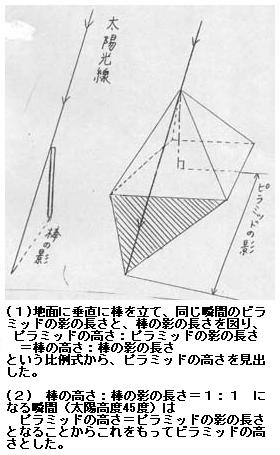 彼はある時、商用でエジプトに渡り、そこにしばらく滞在したが、そこでエジプトの神官からエジプトで得られた数学と天文学に関する多くの知識を学び、まもなく神官を追い越し、その知識を用いて、ピラミッドの影の長さからピラミッドそのものの高さを見出し、時のアマシス王を驚かせたという話がある。