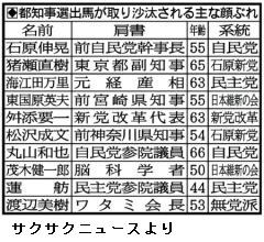 ◆人気投票:「都知事選はときに三百万を超える票を集める、日本最大の“人気投票”。政党が推していない候補者が当選する時代が二十年も続いている」。元副知事の青山佾(やすし)・明治大公共政策大学院教授はこう指摘する。/無党派の新人が初めて当選したのは九五年。元参院議員でタレントの青島幸男氏だ。二年前の都議選で既成政党への批判票を集めた日本新党の躍進が背景にあり、ポスターや街頭演説などの選挙活動をしない型破りなスタイルも注目を浴びた。/九九年に当選した石原氏も、政党の支持を受けずに出馬。告示のわずか二週間前の出馬表明だったが、「かえって新鮮なイメージが高まった」と青山教授。元労相の鳩山邦夫、元国連事務次長の明石康、国際政治学者の舛添要一の各氏ら多彩な他候補を制した。