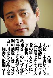 都知事選、白洲次郎氏の孫、出馬の方向 ―― 石原慎太郎東京都知事の辞職に伴う都知事選に、吉田茂元首相の側近として知られる白洲次郎氏の孫で文筆家の白洲信哉氏(46)が出馬の方向であることが28日、関係者の話で分かった。/白洲氏は25日、「健全なる保守主義」を基盤とした政界再編の後押しを目的とした政策勉強会「日本の選択」を設立し、代表に就任していた。/同勉強会は脳科学者の茂木健一郎氏が共同代表を務め、弁護士や若手経営者ら約20人が名を連ねている。徳川宗家19代目で政治・経済評論家の徳川家広氏、三菱財閥を創始した岩崎弥太郎の玄孫の木内孝胤衆院議員らもメンバーで、白洲氏が都知事選に出馬した場合、支援に回るとみられる。/白洲氏は昭和40年、東京都生まれ。母方の祖父は、文芸評論家の小林秀雄氏。細川護煕元首相の公設秘書を務めた経験がある。 (産経ニュース 2012.10.29 00:34) [東京都政]
