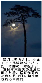 奇跡の一本松:満月と最後の「共演」 陸前高田 ―― 東日本大震災の津波に耐えた岩手県陸前高田市の「奇跡の一本松」が31日、満月に照らされ、最後の「共演」を果たした。保存作業のため、松は中秋の名月を迎える前の9月12日に切り倒されることが決まっている。/震災後、初めて家族で訪れたという同市の男性公務員(41)は「震災前から他の松より大きかったのでよく覚えている」と1歳の赤ちゃんを腕に松を見上げた。/日が暮れ潮風が雲を流すと、被災地の上に真ん丸い月が現れ、一本松のシルエットが浮かび上がった。/震災発生から2年となる来年3月11日までに保存加工は終わり、再び復興のシンボルとして戻ってくる予定。(共同) 〔毎日新聞 2012年08月31日 20時50分(最終更新 08月31日 21時01分)〕