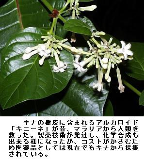 キナ(kina):アカネ科キナ属の常緑高木の総称。葉は卵形・長楕円形や披針形で、対生。花は淡紅紫色や淡黄色。樹皮からキニーネが得られる。南米コロンビアからボリビアにかけてのアンデス山地原産。