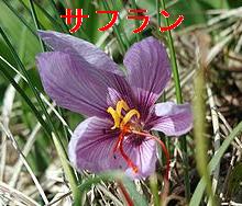 サフラン(saffran):地中海沿岸を原産とするアヤメ科の多年草。およびそのめしべを乾燥させた香辛料。鎮静、鎮痛、通経作用がある。中国では西紅花、藏紅花の名で生薬として流通している。江戸時代末期にオランダ船によりもたらされた。赤い花柱(めしべ)を集めて乾燥させたものを、古代ローマやギリシャでは高価な薬として利用した。日本ではお湯で煎じたものをせき止めや強壮作用などの薬とするほか、食品などの着色料や 香辛料としても使用されている。そのいろんな価値ゆえ、「薬用(やくよう)サフラン」とも呼ばれる。サフランの名前は、”黄色”を意味する、アラビア語の「zafran」からの変化だという。