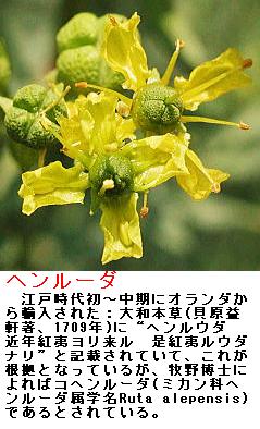 ヘンルーダー(wijnruit):江戸時代に渡来し、葉に含まれるシネオールという精油成分が通経剤・鎮痙剤・駆虫剤などに利用され、料理の香りづけにも使われていたが、毒性があるとされ、今はほとんどその目的には使われていない。オランダ語が訛ったもので、言語の発音wijnruit(ウェインライト)からはすっかり遠ざかってしまった。