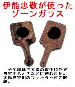 ゾンガラス(zonglass):太陽の明るさを暗くするフィルターで、子午線儀で太陽の南中時刻を測定するとき等に使われた。日本では、天明年間に麻田剛立((あさだごうりゅう、1734~1799年、天文学者)の弟子であった山本彦九郎(詳細不明)が、ガラスに油を燃やしてすすを付着させて作ったのが始まりといわれている。