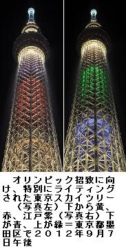 スカイツリー:五輪カラーで「特別ライティング」 ―― 東京都墨田区の東京スカイツリーで7日、五輪カラーの「特別ライティング」が実施された。この日は20年オリンピック・パラリンピックの開催都市決定まで、ちょうど残り1年。ロンドン五輪のメダリスト、競泳の寺川綾さんと重量挙げの三宅宏実さんが点灯イベントに参加した。/五輪カラーの赤、黄、緑、青に加え、江戸紫の計5色を使用。各色が順番にツリーの下から上へ昇っていく動きのあるライティング。寺川さんは「ロンドンでは地元選手へ地響きのような声援があった。東京でそのような声援を受けたら、選手も気分が盛り上がる」と話した。