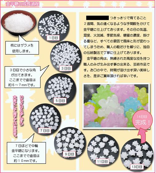 金平糖は、砂糖水で作る、表面に凹凸の角があるお菓子です。日本へはポルトガル人が1550年にカステラと共に南蛮菓子として伝えました。