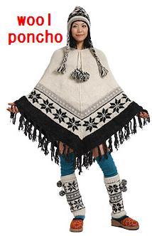 ポンチョ( poncho):中央アメリカ、南アメリカのメキシコ、ペルーやボリビアの原住民の民族衣装で、四角形の布の中央に穴を開けて首を通して着る、outerwear〔アウターウェア、衣服の分類のうち下着や装身具を除いたものの総称〕のこと。防寒・防風のために通常の衣服の上から着用する。/ケープ(cape)と混同されることがあるが、ケープは肩や背中を覆う、袖のないouterwearで、マントの短いものをさす。ポルトガル語のカパ(capa)も語源は同じだが、こちらは日本に入って、合羽(かっぱ)となった。