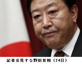 野田首相、竹島問題で韓国を批判―異例のテレビ記者会見―― 【東京】野田佳彦首相は24日夕、首相官邸で臨時に記者会見し、竹島をめぐる問題については韓国が領有権を裏付ける証拠のないまま「不法」占拠しているとして、同国政府を批判、日韓関係の緊張緩和は当分望み薄な状況となった。/野田首相は主要テレビ局全てで放映された会見で「韓国側は我が国よりも前に竹島を実効支配していたと主張しているが、根拠とされる文献の記述はあいまいで、裏づけとなる明確な証拠はない。韓国は力をもって不法占拠を開始した」と明言した。/首相が領土問題について記者会見を行うのは異例のこと。またこの日は、首相会見に先立ち、衆院が本会議で韓国の李明博(イ・ミョンバク)大統領の竹島上陸に抗議する決議を採択した。/一方、韓国政府は野田首相の領有権主張にすぐさま抗議し、主張の撤回を要求した。さらに衆院決議の撤回も求めた。/韓国外交通商省の趙泰永報道官は「歴史的、地理的、国際法的に我が国領土に属する独島(竹島の韓国名)に対して、野田首相が不当な領有権を繰り返し主張したことに強く抗議するとともに、主張を即時撤回するよう促す」との短い声明を発表した。/日本の衆院はこの日、香港の活動家による尖閣諸島上陸を非難する決議も採択した。/日本の管理下にある一方で中国と台湾も領有権を主張している尖閣諸島に香港の活動家が上陸した問題については、日本当局が逮捕した活動家を刑事処分ではなく、強制送還という処置を選択したことから、野田政権の対応に対して厳しい批判が生じている。/野田首相は尖閣諸島と竹島の問題を念頭に「我が国の周辺海域において、我が国の主権に関する事案が相次いて起こっており、誠に遺憾の極みだ。我が国として、このような行為を看過することはできない」と述べた。/さらに、「我が国固有の領土である離島の主権を確保するということは、海洋国家日本の壮大なフロンティアを守るということにほかならない」とし、離島の警備を強化するための海上保安庁法改正案の早期成立を呼び掛けた。/今後数カ月中に総選挙が実施される可能性が高いことから、首相と与党民主党は領土問題で弱腰姿勢を見せるわけにはいかないというのがアナリストらの見方だ。/早稲田大学で政治学を教える山本武彦教授は、(民主党政権は)選挙が近づいているために強硬路線を取らざるを得ないのが実情、と述べ、「これは民主党の本来の外交姿勢ではない」と指摘する。/民主党は2009年に政権を獲得した際、アジア諸国との関係強化を外交政策の柱とした。そのため、閣僚は、韓国が竹島を実効支配していることについて、「不法占拠」という表現をすることを控えてきた。/日本政府は今週初め、竹島をめぐる韓国との領有権問題を国際司法裁判所(ICJ)に提訴する方針を決めた。また、野田内閣の閣僚らは予定されていた韓国政府閣僚との会合を延期した。野田首相は23日、首相が親書の形式をとり李大統領宛てに送った抗議書簡を韓国政府が返送しようとしたことについて、「冷静さを欠いた」行動と批判した。/さらに日韓の対立は両国の経済的な関係にも影響を及ぼす恐れが出てきた。日本の安住淳財務相は24日、日韓通貨スワップ協定の縮小を検討することに加え、準備を進めてきた韓国国債の購入を当面見送る考えを示した。/韓国政府は竹島には領有権問題が存在しないとして、日本によるICJ共同提訴の提案を拒否した。ICJへの提訴は当事国双方の同意が義務付けられており、日本が単独提訴しても裁判は始まらない。/両国とも公選された政府関係者が融和的な行動にでるようなリスクを冒すことはないだろう。そのため、両国間の緊張を緩める動きは非公式の「バックチャンネル」外交に頼らざるを得ないというのが早稲田大学の山本氏の見方だ。/ただ野田首相は韓国を「大切なパートナー」と表現した上で、「いたずらに国内の強硬な世論を煽って、事態が無用にエスカレートすることはいずれの国の利益にもならない」として、両国がお互いに冷静に対応していくよう呼び掛けた。 〔ウォール・ストリート・ジャーナル日本版 2012年 8月 25日 10:50 JST 〕
