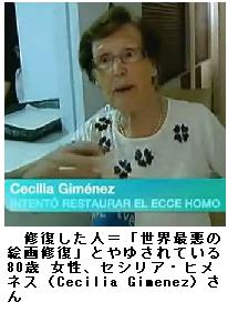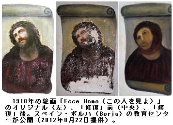 「世界最悪」の修復キリスト画に集まる賛否両論の声 ―― 【8月24日 AFP】スペインの教会にあるキリスト絵画を善意で修復し、オリジナルとは似ても似つかぬものとなってしまったことで、「世界最悪の絵画修復」とやゆされている80歳女性、セシリア・ギメネス(Cecilia Gimenez)さんが、世界的に話題の人となっている。/ギメネスさんが「修復」した絵は、北東部ボルハ(Borja)の教会にある、スペイン人画家エリアス・ガルシア・マルティネス(Elias Garcia Martinez)が1910年に描いた「Ecce Homo(この人を見よ)」。いばらの冠をかぶせられ悲しげに天を見上げるイエス・キリストを描いたこの絵も、年月とともに傷みが目立ち始めていた。そこでギメネスさんが自主的に修復を試みたところ、顔は血色の悪いサルのようで、目鼻立ちはバランスが悪く、さらには頭を毛皮が覆っているような姿となってしまい、多くの苦情が寄せられたという。/その一方で、ヒメネスさんが「修復」したキリスト画は、世界各地のネットユーザーたちに笑いのネタを提供し、スペインでは、修復された絵の顔の部分に、スペイン国王フアン・カルロス1世(Juan Carlos I)やマリアノ・ラホイ(Mariano Rajoy)首相を埋め込んだ独自のバージョンを投稿するネットユーザーも現れた。/さらに、ヒメネスさんの修復画をゴヤやムンク、モディリアニらの名画に例え、ボルハ市に原画を復元する計画を思いとどまるよう求めるオンライン嘆願書には5000人もの署名が集まった。/嘆願書サイトを立ち上げたユーザーは、修復された絵は「教会の天地創造説を巧みに批判し、新たな偶像の復活に疑問を投げかけるものだ」と同サイトでコメントしている。/だが、元のキリスト画を描いたマルティネスの孫に当たるテレサ・ガルシア(Teresa Garcia)さんは、ヒメネスさんによる修復には全く感銘していない。国営テレビRTVEのインタビューでガルシアさんは、「これまで(ヒメネスさんは)衣服以外には手をつけなかった。今回、彼女は頭部にまで手をだし、明らかに絵を台無しにしてしまった」と不満を語った。/その一方で、ヒメネスさんの妹、エスペランサ・ヒメネス・スエコ(Esperanza Gimenez Zueco)さんは、「姉は世界で最善の信仰心をもって修復に取り組んだ」とヒメネスさんを擁護しながら、「ちょっと絵心を加えたかったのでしょう」と付け加えた。 〔AFP BB News 2012年08月24日 18:09 発信地:マドリード/スペイン〕