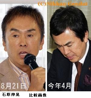 大丈夫!? 石原伸晃 激ヤセと頭髪 悪い病気なのか ―― 一体、どうしたのか――。自民党の石原伸晃幹事長(55)の風貌の変わりぶりが話題になっている。/ここ数カ月で激ヤセし、一時は茶髪にしていた自慢の頭髪も、ご覧の通りめっきり寂しくなってしまったのだ。/21日、党本部で東京都連の支部長会議が開かれ、都連会長の伸晃も出席したが、あまりの変化に、参加者からは「覇気がない」「悪い病気にでもなったのか」と案ずる声が聞かれた。/伸晃の事務所は「体重も、頭髪の量も変わったとは思いません。昔のままのはずです」と言うが……。/「党内では、『いつもの断食だろう』とのウワサが流れています。身長178センチの石原さんですが、15年前に体重が80キロを超え、父・慎太郎さんから静岡の『断食道場』を勧められた。半信半疑で道場に行き、運動しながらニンジンジュースで1週間過ごすと、一気に痩せたようです。以降、お気に入りで、ほぼ毎年道場に通っている。今年6月以降、『朝も夜も外食ばかり』とボヤいていたので、コッソリ静岡に行ったのかもしれません」(自民党関係者)/断食まで父親に面倒見てもらうなんて、相変わらずのお坊ちゃんだが、本当に断食したのなら頭髪の方は薄くはならない。やはりクスリの副作用など、なにか違う原因があるのではないか。/「心労がたまったのでしょう。自民党幹事長として民主党を追い込めず、野田首相から『近いうち解散』を引き出したものの、ノラリクラリかわされている。また、来月の総裁選への対応でも悩んでいる。立場上、『谷垣さんが出れば、出馬しない』と明言していますが、本心は出たくてしようがない。自身のグループからも出馬を求める声が上がっているし、森元首相や古賀元幹事長ら長老もウラでせっついている。出馬が確実の石破茂前政調会長へのライバル心もある。しばらく悩みは続くでしょう」(政治ジャーナリスト・小谷洋之氏)/ボンボン議員の「激ヤセ」と「寂しい頭髪」が、もうしばらく見られそうだ。 〔日刊ゲンダイ 2012年8月24日 掲載〕