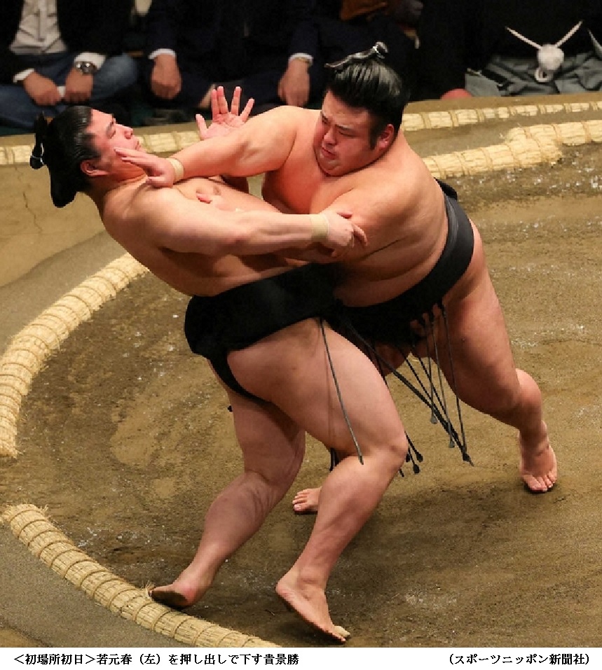 1横綱11大関という1898年1月場所以来125年ぶりの珍しい番付となった初場所は、横綱・照ノ富士が両膝痛悪化により3場所連続の休場が決定。出場力士の中で番付最高位となった大関・貴景勝は結びの一番で新たに小結に昇進した若元春と対戦。相手の勢いを上手くいなして若元春の体が泳いだ所を押し出し、白星発進を飾った。