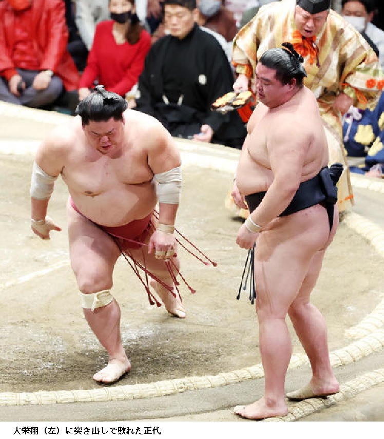 大関から陥落、2桁10勝以上で大関に復帰できる関脇正代だが、過去8勝14敗と苦手の大栄翔にまるでいいところなく突き出されて2連敗となった。