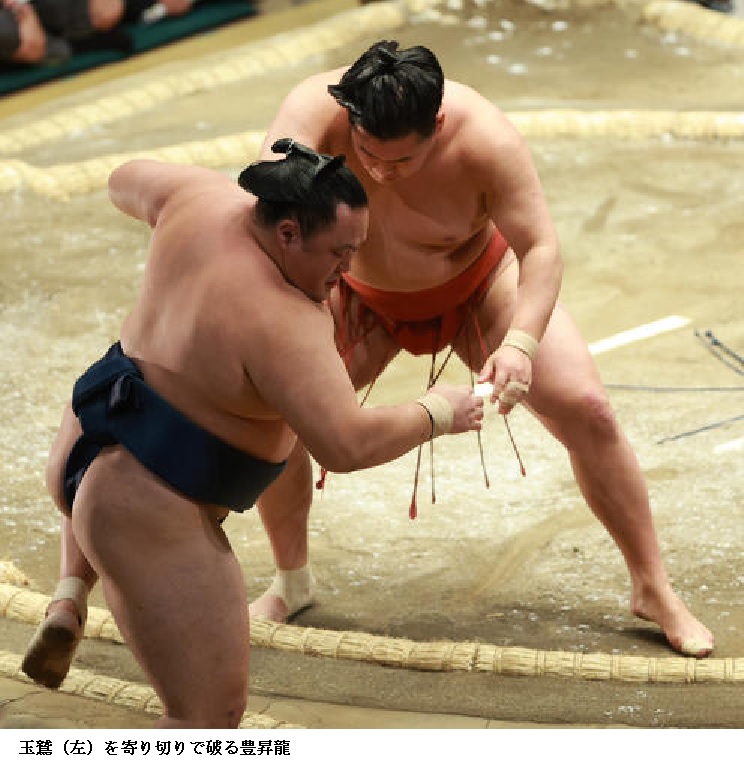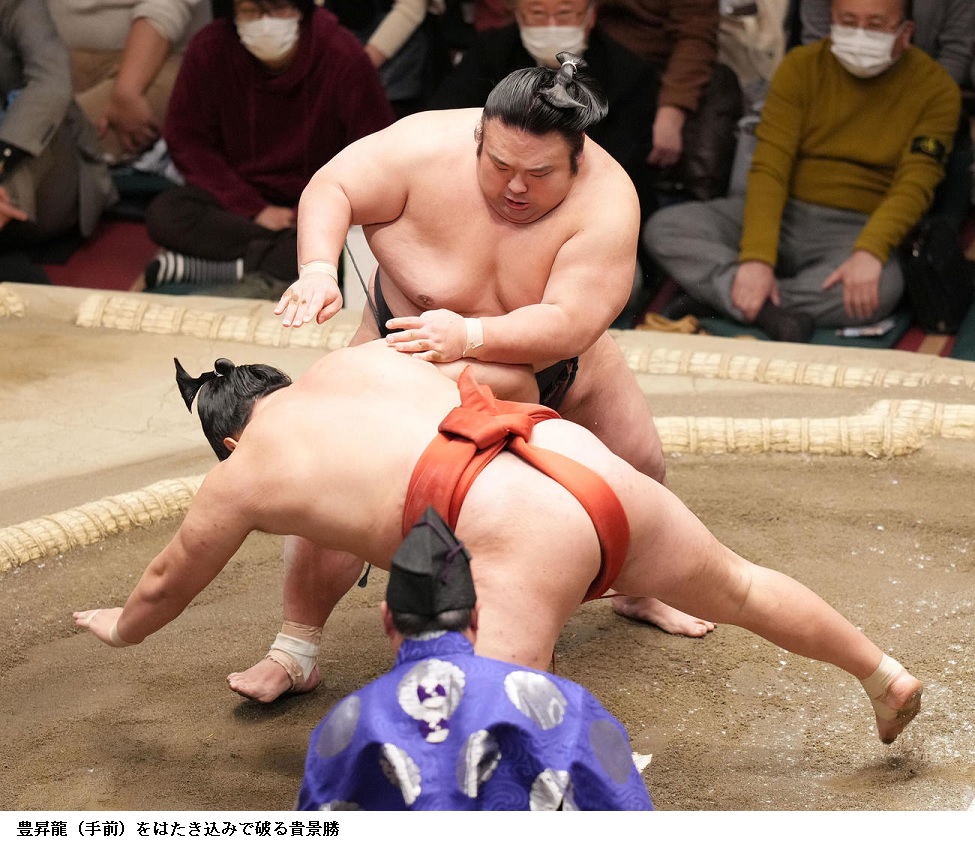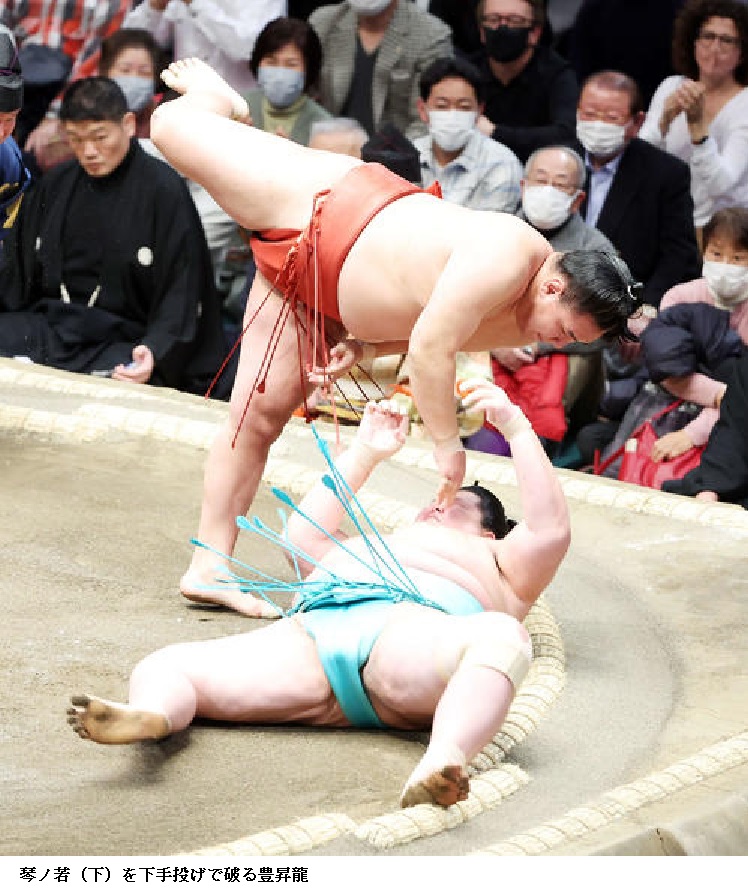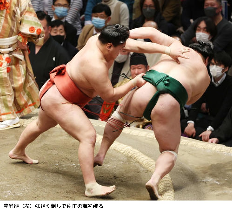 関脇豊昇龍は立ち合い、右への変化で佐田の海を送り倒し。6勝2敗で優勝争いに踏みとどまった。