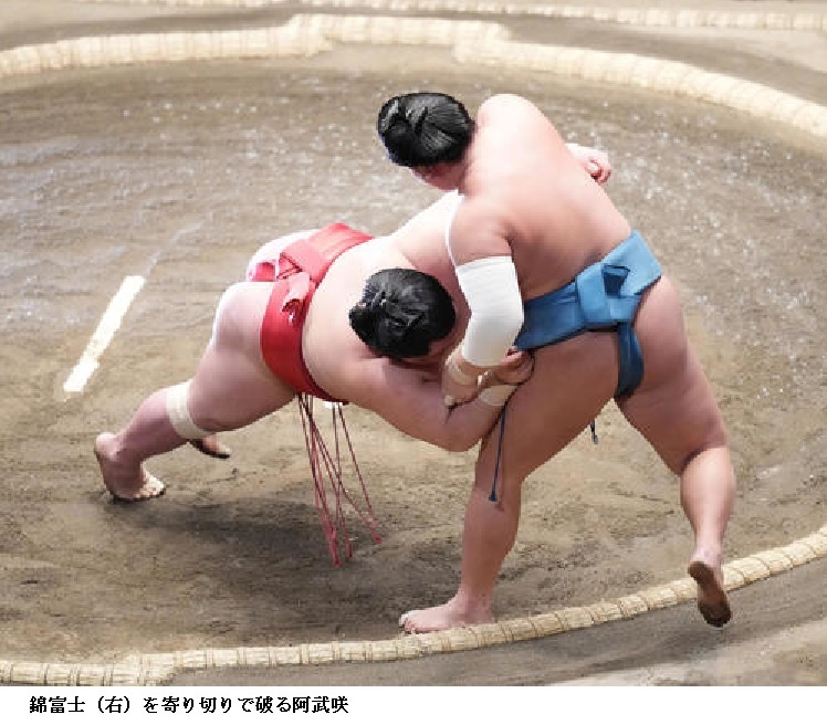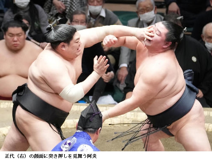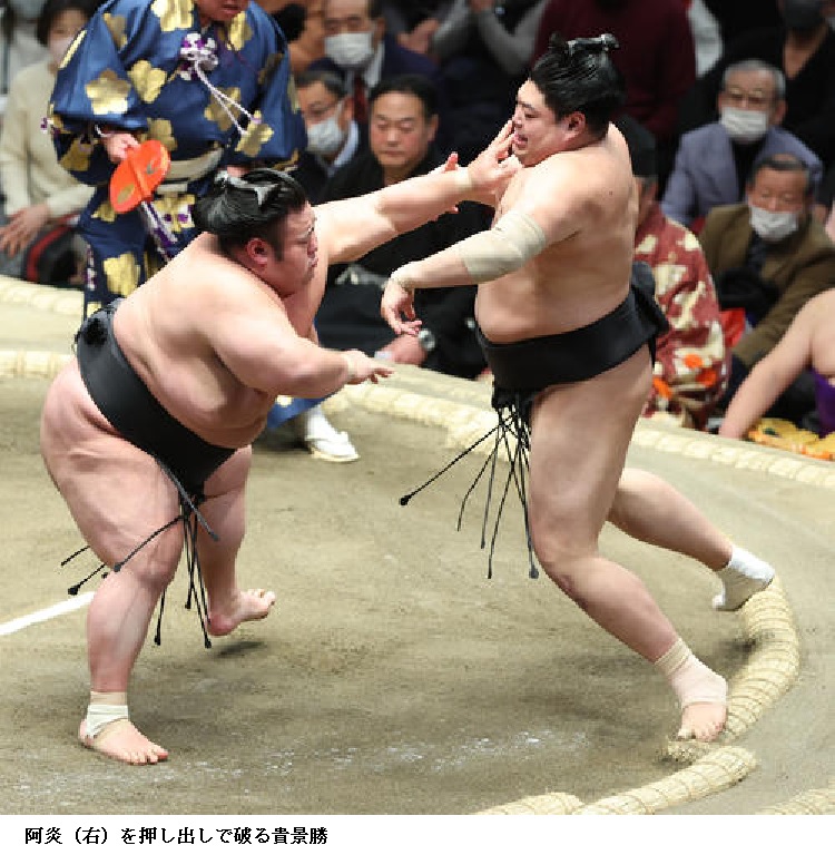 先場所、初優勝を飾った東前頭3枚目の阿炎は新小結の若元春と対戦。物言いがつく際どい勝負を制して2連勝とした。土俵際でもつれたが、右肘で押すような執念を発揮して突き落とした。