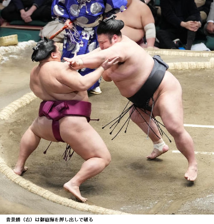 大関候補の関脇豊昇龍は新小結琴ノ若を下手投げで2連勝。一方、若隆景は大関経験者の御嶽海に送り出されて初黒星を喫した。