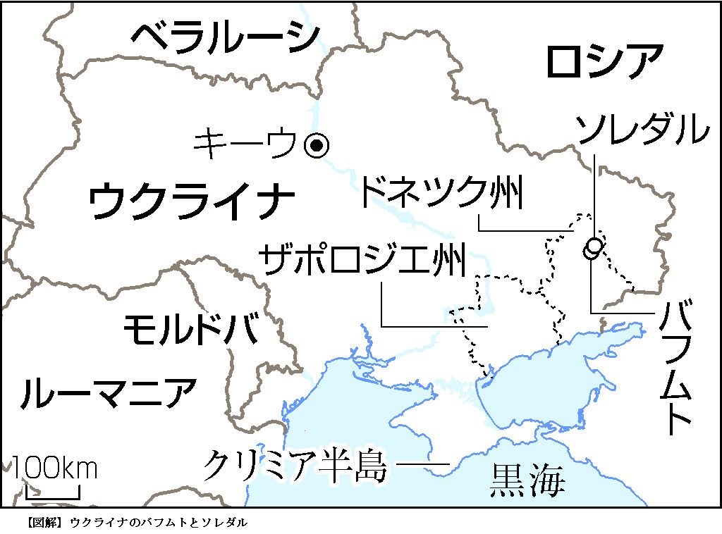 ロシア掌握を否定 東部拠点、撤退の目撃情報も―ウクライナ ―― ロシア国防省がウクライナ東部ドネツク州の拠点、バフムト近郊の町ソレダルを12日夜に「掌握」したと発表したことについて、ウクライナ軍参謀本部は13日、「ソレダルを巡る戦いは続いている」と否定した。ただ、現地の米CNNテレビ取材班は、ウクライナ軍が13日午後、ソレダルから部隊を引き揚げる様子が目撃されたと報じた。