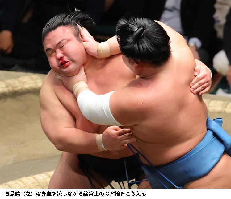 東前頭4枚目の錦富士と対戦。激しい押し合いからいなされてピンチもあったが、最後は何とかはたき込んだ。大関は口のまわりを血で染め、錦富士の肩にも返り血がつく激闘だった。
