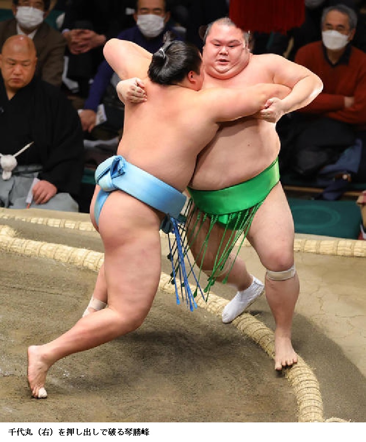 東前頭13枚目の琴勝峰が千代丸を押し出し、7勝目と勝ち越しに王手をかけた。平幕の他の1敗勢がことごとく敗れ、優勝争いに絡んでいる。