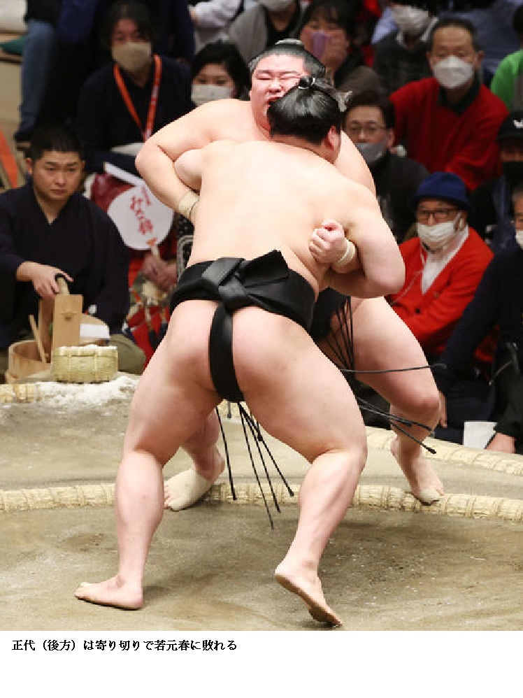 関脇正代は新小結若元春に寄り切られて6敗目。今場所の2桁10勝の可能性はなくなり、大関復帰も消滅した。 [日刊スポーツ 2023年1月15日18時12分]