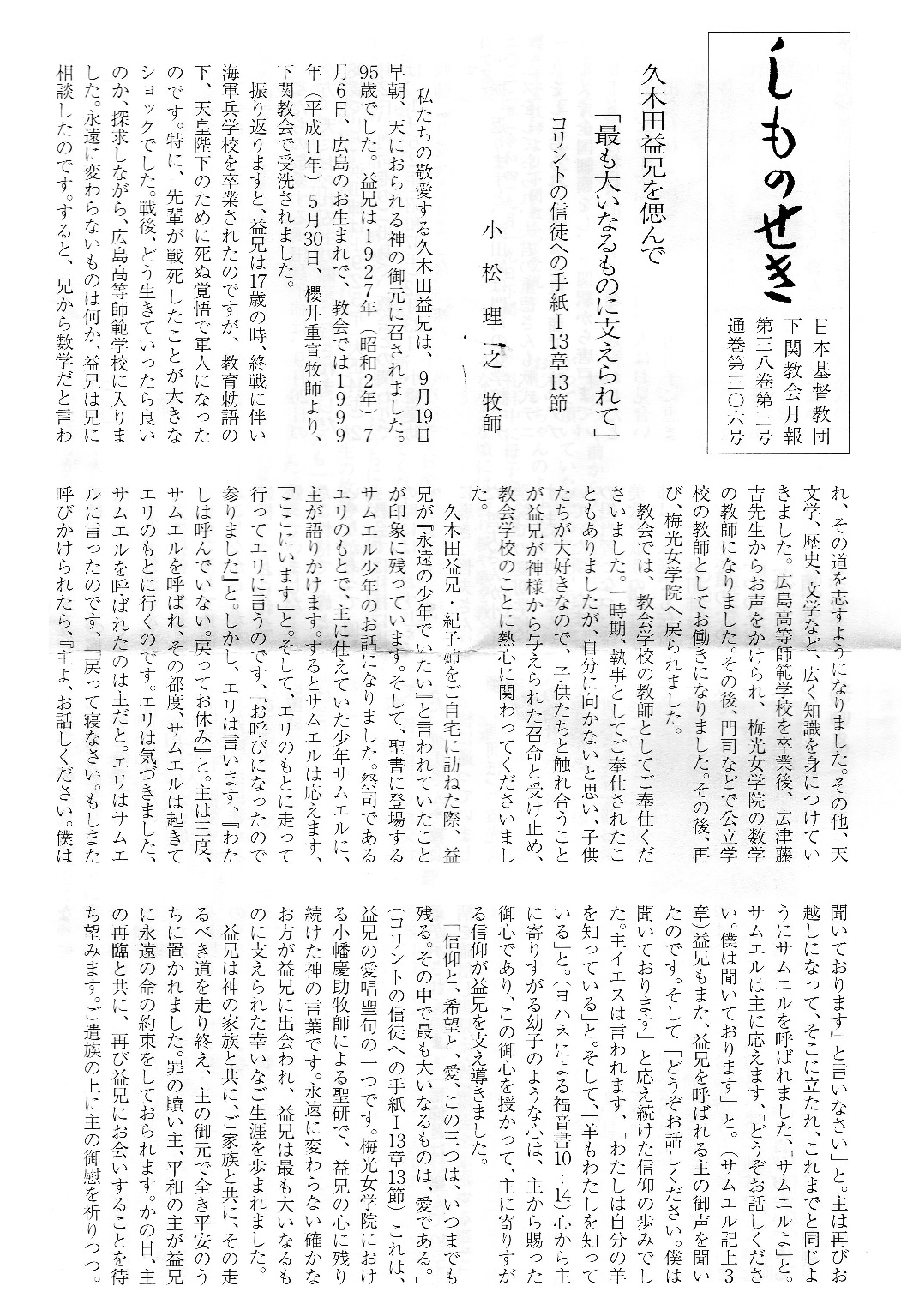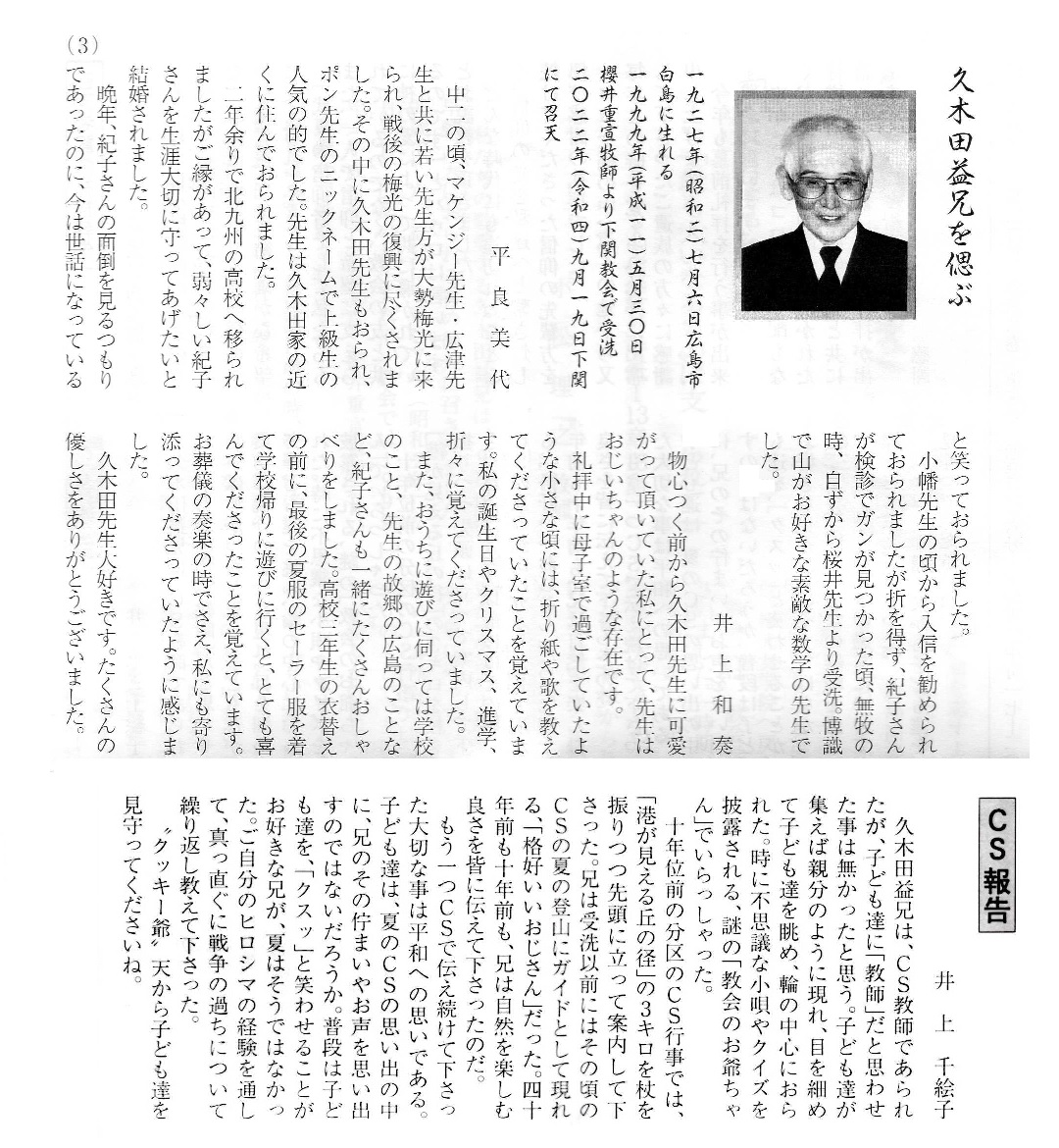 下関の義姉から、「下関教会」の月報が送られてきました。昨年亡くなった実兄久木田益の記事が載せられていました。