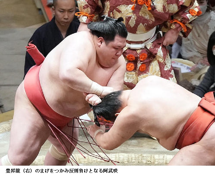 7勝7敗で千秋楽を迎えた関脇豊昇龍は阿武咲との一番で相撲は完敗も物言い。「まげつかみ」の反則で白星を拾い、勝ち越しを決めた。 [日刊スポーツ 2023年1月22日21時9分]