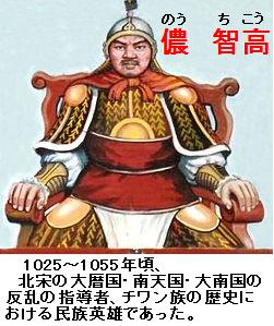 ※今でも中国のベトナムに接する地域と、ベトナム北部に住むチワン系の少数民族は儂(ノン)族といっているが、儂智高はその儂族の首酋(しゅしゅう)。儂氏はもと南漢劉氏に服属していたが、宋が南漢を滅ぼすと宋に内属、しかし宋の太宗によるベトナム討伐失敗後は、ベトナムの李朝大越国に服属、さらに智高の父儂存福の時、宋に通じて大越に反して独立、長生国をたてたが大越の討伐を受ける。子の智高は大越に反しつつ、宋の領内、いまの広西チワン族自治区内に侵入し南天国と称し宋への内属を願い出たが許されなかった。そこで皇祐四年、邕州を陥(おとしい)れ宋の領内に大南国を建てたのである。狄青の軍に破られた後、儂智高は大理〔雲南省〕へ逃亡したが、その後の生死は不明という。