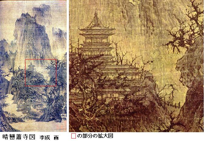 〔訳〕李成が画く山上の亭館(やかた)や楼塔(たかどの)のたぐいは、みな高い軒を仰ぎ見るように画いてある。下から上を望めば、人が平地で塔を見上げるように、軒のたるきまで見えるものだから、というのであるが、この論は間違っている。おおむね山水を画く法というものは、人が築山を見るように、実際には大きなものを、実際より小さく見取るものである。もしすべて本当の山の大きさの通りに山々を画く法を取って、下から上をのぞんだら、山がひとつ見えるだけで、重なり合う山々を見渡すことはおろか、谷あいのこまごましたものまで見えるわけはない。また家屋について、その中庭や屋敷の後ろまで見えるはずはない。もし人が東側に立てば山の西側は遠方に位置するものだし、西側に立てば山の東側が遠方になるもの。これをどのようにして画にすればよいか。李成は、大きなものを小さく見取る法〔遠近法を取り入れた鳥瞰(ちょうかん)図法〕を知らないのだ。屋根のすみをはねあげるなどということではなくて、高さを按排したり、遠近を安排するところに画のうまみがあるのだ。