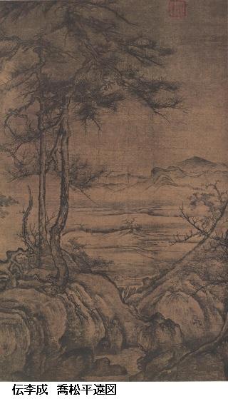 ※李成(りせい、919~967年頃)、字は咸熙(かんき)。五代、北宋初期の山水画家。青州〔現在の山東省濰坊〕の人。唐の宗室とも言われる。営丘に移り住んだ事から李営丘ともいう。北宋初期には范寬、関仝と並んで「三家鼎峙(ていじ)」とも言われ、多く淡墨の山水を描いて「惜墨如金」ともよばれ、夢霧の如しとも言われた。のち、郭煕〔かくき、1023?~1085?年〕などがその画風を継承し、李郭派と呼ばれた。「喬松平遠図」が伝世の中で最もよくその画風を伝えるとされる。