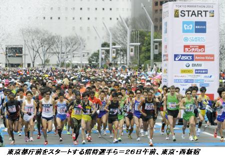 東京マラソンがスタート 3万5千人都心駆ける ―― ことしで6回目となる東京マラソンは26日、東京都庁前から臨海副都心の東京ビッグサイトまでのコースで行われ、3万5千人を超えるランナーが曇りの好条件の中、続々とスタートを切った。/ロンドン五輪男子マラソンの代表選考会を兼ねており、招待選手では五輪初出場を目指す公務員ランナーの川内優輝選手(埼玉県庁)や前世界記録保持者のハイレ・ゲブレシラシエ選手(エチオピア)らが出場した。マラソンブームで参加申し込みは28万人を超え、抽選は過去最高の倍率になった。 2012/02/26 10:18 【共同通信】