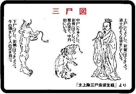 〔訳〕道家の説に、三尸(さんし)または三彭(さんぽう)というのがあり、すべての人の体内にこの三つの虫がいて、人の過失をちゃんと覚えいて、庚申(かのえさる)の日になると、人が寝込んだ好きに、天に昇って上帝にそれを讒言するのだという。そのため、道教を奉ずる人たちは、庚申の日になると一晩中値ない。それを「守庚申」と称している。あるいは薬を飲んで三虫を殺す人もいる。小人どものでたらめさも、ここまで来ては何をか言わんやだ。