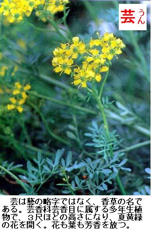 〔訳〕古人は蔵書の虫除けに芸(うん)を用いた。芸は香草であって、いまいわゆる七里香がこれである。葉は豌豆(えんどう)のそれに似ており、小じんまりと群って生える。その葉はきわめて香りがよく、秋過ぎて葉の間は白粉をまぶしたように少し白くなり、虫除けの効果が特に顕著である。南方人はこれを採集して席(しきもの)の下に置き、蚤や虱除けにする。私が昭文館で書籍の編修校訂の職に任じられた時、数株の芸を潞公(ろこう)の家からもらい、秘閣〔ひかく、貴重な文書などを所蔵する宮中の書庫〕に移植したが、今はもうない。