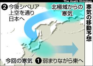 氷点下列島 46県庁所在地の3日の予報 ―― 北日本を中心に零下42度を下回る寒気が流れ込んでいる影響で、2日も日本海側を中心とした大雪と全国的な冷え込みが続いた。この寒気はいったん緩むが、別の寒気が再び日本を襲う可能性があるという。大雪のピークは過ぎたが、3日も降り続く見込み。気象庁は雪崩などへの注意を呼びかけた。/気象庁によると、2日は北海道から沖縄まで、平年より厳しい寒さを記録した。3日の予想も、沖縄を除く46都道府県庁所在地のすべてで、最低気温が0度を割るところまで冷え込む見込みとなっている。/1月全体でみても、大半の地域で平均気温は平年より低くなった。東京都心の1月の平均気温は、平年値より1.3度低い4.8度。5度台を割り込むのは2001年以来で、4.5度を記録した86年以来の水準となった。/大雪の影響も各地で深刻だ。2日夕の時点で、青森市(酸ケ湯)の積雪はなお420センチ以上ある。山形県や新潟県でも300センチ超が続くところが3地点ある。24時間降雪量は、滋賀県高島市で61センチなど西日本の各地も目立つ。太平洋側の名古屋市でも16センチとなった。冬型の気圧配置の強まりを受けて風も強まり、一部では吹雪となった。/3日午後6時までに予想される24時間降雪量は多いところで、北陸50センチ、東北・関東甲信(群馬県、長野県中心)40センチ、中国30センチ、東海(岐阜県中心)、近畿、九州北部20センチとなっている。四国の山地でも雪が降る見込み。風も続き、北海道南部から中国地方にかけて、ところによって最大風速15メートル前後の吹雪となる恐れがあるという。/気象庁によると、寒気は弱まりながら東に進み、来週初めにかけて収まるとみられる。しかし、その後、北極側からの寒気が今度はシベリア東部を回り込む形で日本に接近する見込みで、北日本や東日本は再び影響を受けそうだという。(朝日新聞デジタル 2012年2月2日18時15分)