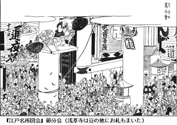 浅草寺の節分会(せつぶんえ)。テレビのニュースなどで賑やかな節分会の風景は、今も昔も変わりない。当時浅草寺は先進的なお寺だったらしく、大がかりな節分会を行ったのは、関東で最初だったと伝えられている。浅草寺に倣って豆まきの風習がだんだん江戸庶民に広まったのは、江戸の中期以降のことだ。/豆まきの行事は実際は古くから行われており、「追儺(ついな)」とか「鬼やらい」と呼ばれた。平安時代、宮中において大晦日に盛大に行われ、その後、諸国の社寺でも行われるようになった。古く中国に始まり、日本へは文武天皇の頃に伝わったという。節分に除災招福のため、豆を撒(ま)く行事は、追儺の変形したものであるらしい。/つまり、最初は宮中の行事だったものが寺社でも行われ、やがて一般化したものと思われる。大晦日とあるのは、旧暦(太陰太陽暦)の関係で、立春が正月に当たるからである。/節分は字が示すように季節の分かれ目で、立春、立夏、立秋、立冬それぞれの前日を指す。もともと年に4日あったことになるが、立春の前日だけが残ったのは、厄を払って新年を迎えるという別格の節分だったからだろう。/ではなぜ、まくのは豆なのか。他の物ではいけないのだろうか。基本的には、大豆を炒(い)ったものを使用することになっている。「マメに暮らすため」とかいうのは都合良すぎはしないか。/米や小豆は、ちょっと小さすぎて投げにくい。鬼をやっつけるには迫力に欠ける。小石を投げるという手もあるが、これだと障子が破れたり物が壊れるので具合が悪い。それ以前に、大豆のような貴重な食べ物を投げてしまって良いのかという素朴な疑問も残る。/大豆は、「畑の肉」と言われるほど栄養価の高い食べ物であることは当時も知られていたはずである。食べ物を投げるという行為は、どうしても日本の文化や日本人の精神構造として、そぐわない。まいた後、拾って食べれば良いという合理的な考え方もあるにはあるが…。/『古事記』には、イザナミノミコトが鬼に桃を投げる場面があるそうで、鬼は桃が苦手だったらしい。その時の桃は熟した桃だったのか桃の種だったのかは分からない。中国では古くから、桃には鬼を退治する霊力があると考えられていて、それが伝わったようだ。鬼ヶ島に鬼退治に出かけた昔話、『桃太郎』も桃だった。この桃が時代を経て、現実的に入手しやすい大豆に転化したとの説もある。