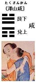 咸(かん)は感、少男〔艮〕が少女〔兌〕に下り相感ずる卦象に取る。感応すればおのずから享通するが、たがいに貞正であることがよろしい。このようであれば妻をめとるにもきちである。