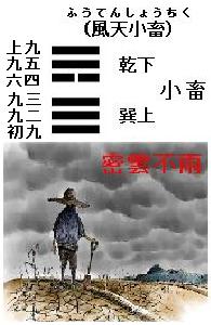 ※なお易の卦辞は周の文王の作と言われる。してみれば密雲雨ふらずと云々とは、文王が羑里(ゆうり)に捕えられて易を書いたとき、わが志は天下経綸にあれど、今は君主たる殷の紂王と志相和せず、雨沢人民に及ばず、小しく畜められたる時なるかなという嘆息の意を寓したものとも見られる。