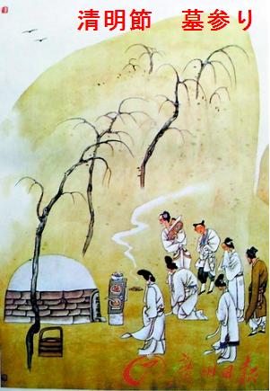 寒食の第三日が清明節である。新仏の墓には、みなこの日に墓参りに行き、都の者は郊外に繰り出した。公室は半月前に宮人に車馬を御陵にさしむけられ、、皇室の近親も諸陵に分遣されて祭祀が行われた。従者はみな紫の衫(ひとえ)に白絹の三角子(ひざあて)、青の行纏(きゃはん)を付けるが、これはすべて官給品である。また寒食節の日になると皇室は奉先寺道者院に車馬を出され、宮人たちの墓参りも行われた。車はみな金色に装い紺色の幔幕を張り、錦の額と珠簾をつけ、二組の綉扇(しゅうせん)と、薄絹の提灯を持ったものが前導した。