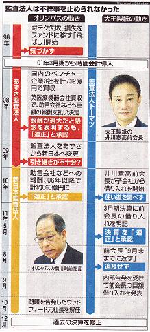 オリンパス上場廃止は回避 大王製紙も中間決算―― 巨額の損失隠しが発覚したオリンパスは、14日の提出期限までに決算報告書などを提出し、上場廃止をひとまず回避しました。/オリンパスが発表した今年度の中間連結決算は、黒字見込みから一転して323億円の赤字となりました。債務超過は回避したものの、自己資本比率は大幅に減らしました。東京証券取引所は今後、オリンパスの上場の是非を判断することになります。/また、巨額の借り入れをめぐり、前会長が逮捕された大王製紙も中間決算を発表しました。