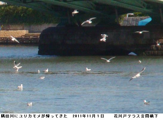ここのところ足を痛めたらしく、歩行するに脹脛(ふくらはぎ)が痛くて、歩行困難に陥る。というわけで、2週間ほど外出を控えていた。昼食後、久し振りに東武線の橋梁から桜橋までテラスを歩いて見たが、半分辺りから、やはり、右足の脹脛が痛み出し、足を引きずって、帰宅した。言問橋の下ではいつのまに帰って来たのかユリカモメが飛び交っていた。山谷堀水門前の広場は平成中村座が占領。来年5月までの興行になるとか。