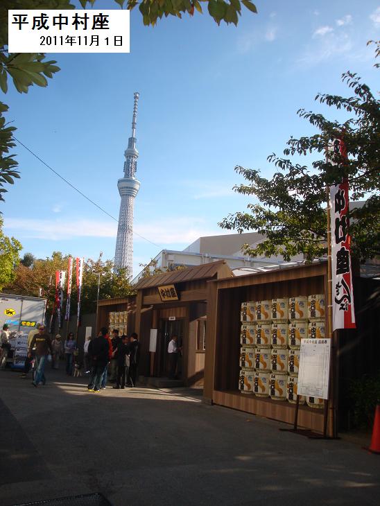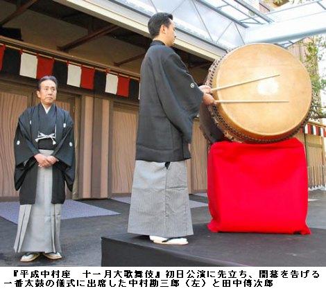中村勘三郎、旗揚げの地・浅草での『平成中村座』に歓喜 ―― 歌舞伎俳優の中村勘三郎(56)、田中傳次郎(34)が1日、東京・浅草の隅田公園で行われる『平成中村座 十一月大歌舞伎』初日公演に先立ち、開幕を告げる一番太鼓の儀式に出席した。秋晴れの空に傳次郎の力強い太鼓が響く中、勘三郎は「またこの墨田の地に帰らせていただいた上、7ヶ月の間も立たせてもらうので、地元の皆さんにご迷惑をかける分、いい芝居をしたい」と、旗揚げの地・浅草での公演に感慨ひとしお。「スカイツリーを観ながら、ぜひ足を運んでいただけたらと思います」とアピールした。/一番太鼓は江戸時代、芝居が始まる前に打たれた太鼓の総称。1624年に初世田中傳左衛門が開場を知らせる太鼓を打ったのが始まりの『平成中村座』ならではの初日儀式。開場前から列を作る観客に迎えられて登場した勘三郎は「清々しい陽気でなにより。一人でも多くの方に観てほしい」と笑顔。仮設劇場の真裏にはスカイツリーがそびえる抜群のロケーションになっており「『中村座』のほうが先にあるので、決して狙ったわけではないですよ」と笑わせた。/同公演は「江戸時代の芝居小屋を現代に復活させ、多くの方々に歌舞伎を楽しんでいただきたい」という勘三郎の思いから産声を上げた、江戸の芝居見物気分を味わえる体験型エンターテインメント。同日から来年5月まで、初のロングラン公演となる。 (ORICON 2011年11月01日 11時41分)