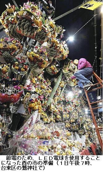 復興も祈願する酉の市、境内はLEDで節電 ―― 商売繁盛を祈願する恒例の「酉(とり)の市」が2日午前0時、東京・浅草の鷲(おおとり)神社で始まり、趣向を凝らしたさまざまな熊手を求める人たちでにぎわった。/2日は一の酉で、境内には縁起物の熊手が所狭しと並んだ。例年、売れ筋は3万円前後といい、来年オープンする東京スカイツリーや、女子サッカー日本代表「なでしこジャパン」の選手の顔をあしらったものが参拝客の目を引いていた。/今年は東日本大震災の後でも祭りができることへの感謝と節電の意味を込め、境内の電灯1000灯をすべてLEDにしたという。/権禰宜(ごんねぎ)の小菅徳人さん(34)は「一日も早い復興を祈っています」と話していた。二の酉(14日)、三の酉(26日)にも開かれる。(2011年11月2日00時27分 読売新聞)