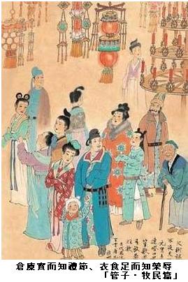 管仲は、政治を任されて斉の宰相になった。姓は微小な国で、しかも海に面した辺鄙に地であったが、貨物を流通させて蓄財し、国を富ませ兵力を強大にし、衆俗の好悪にしたがって大衆を導いた。それ故にその言説(『管子』牧民篇)にいう。